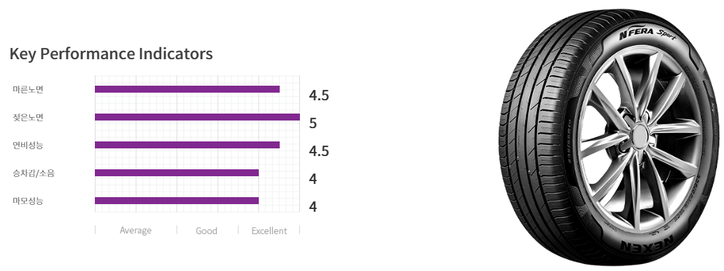 - 가속력 및 제동력 향상: 타이어 중앙 블록의 강성을 강화하여 높은 접지력을 확보하고, 가속력과 제동력을 향상합니다.