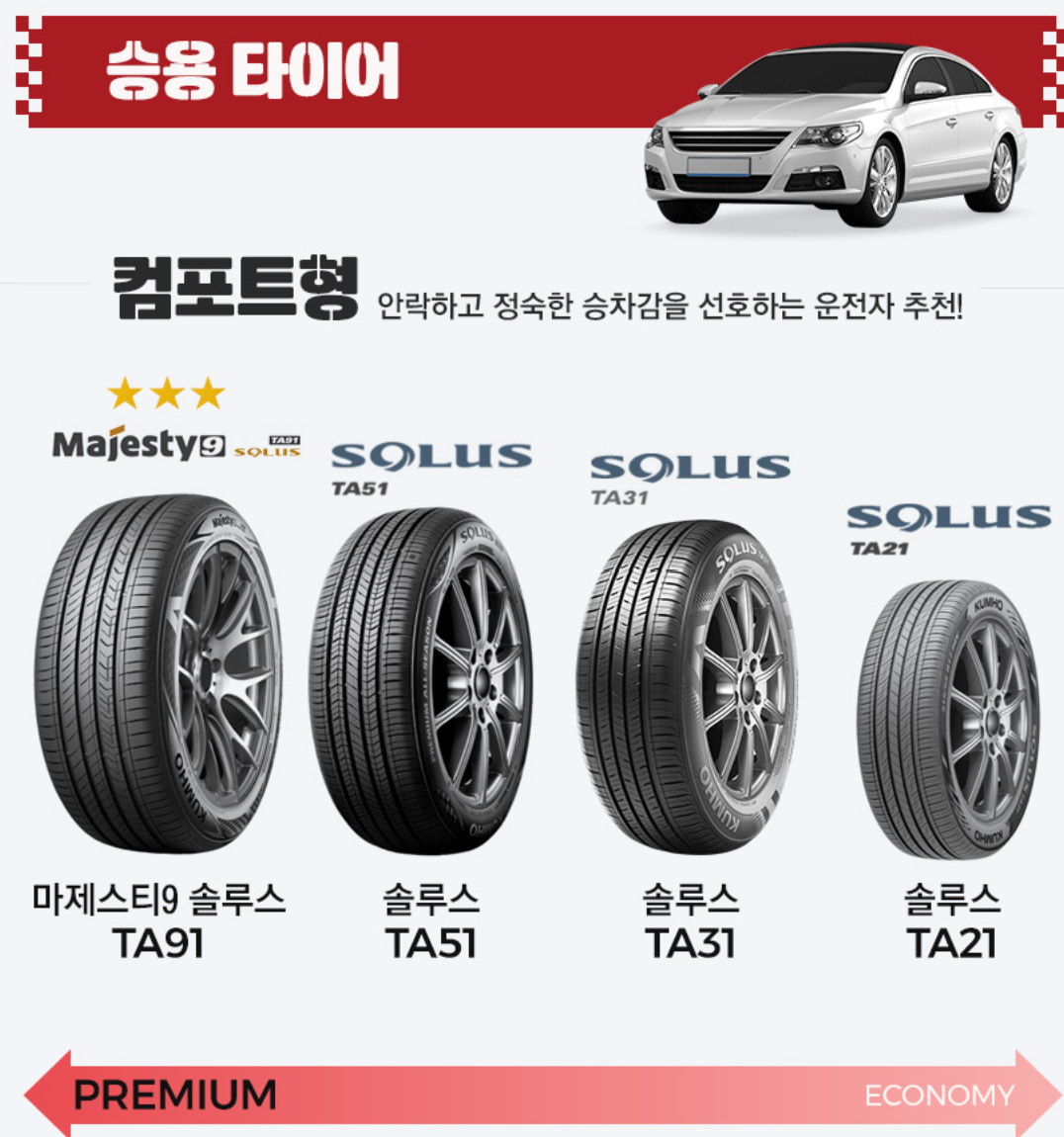 | 승용차 | 정숙/부드러운 주행 | 컴포트형 | TA91, TA51 |