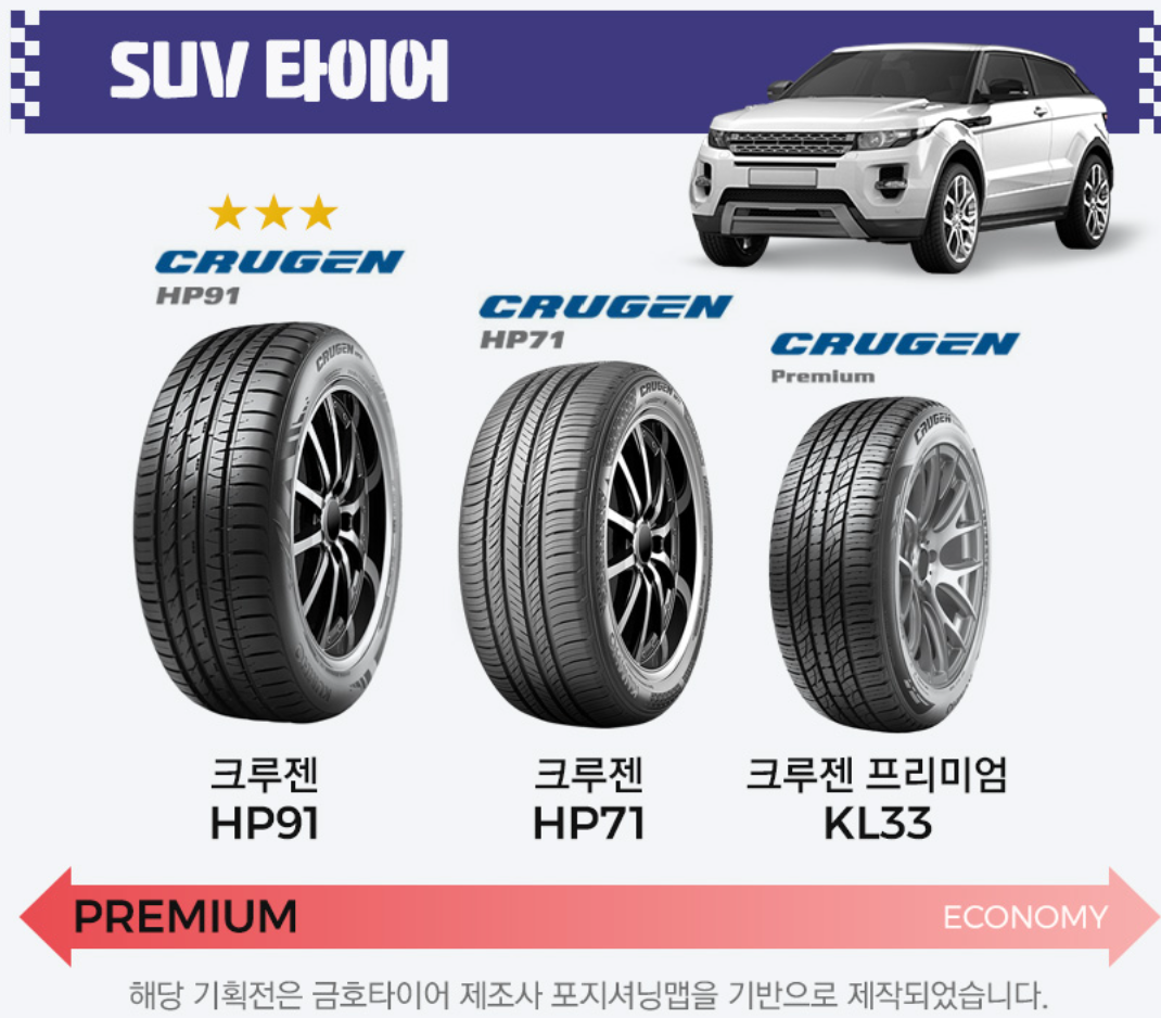 SUV 차량은 무게가 크고 다양한 노면에서 주행하기 때문에, 그에 맞는 전용 타이어가 필요하다. 금호타이어는 SUV에 특화된 ‘크루젠’ 라인업을 보유하고 있다.