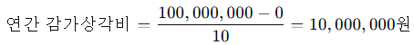 - 1억 원짜리 기계를 구입했으며, 잔존가치는 0원, 내용연수는 10년이라고 가정합니다.