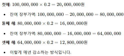 - 둘째 해 감가 상각비: 8천만 원 × 20% = 1천6백만 원 (남은 가치: 6천4백만 원)