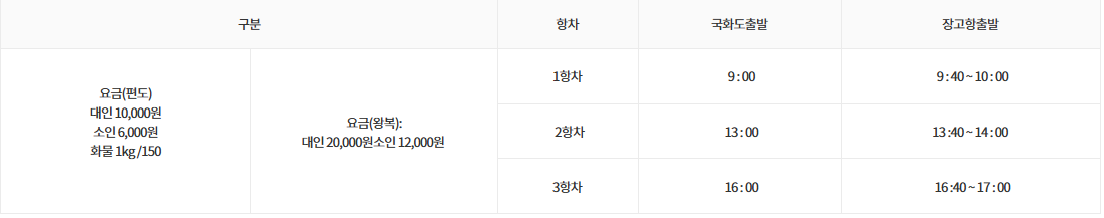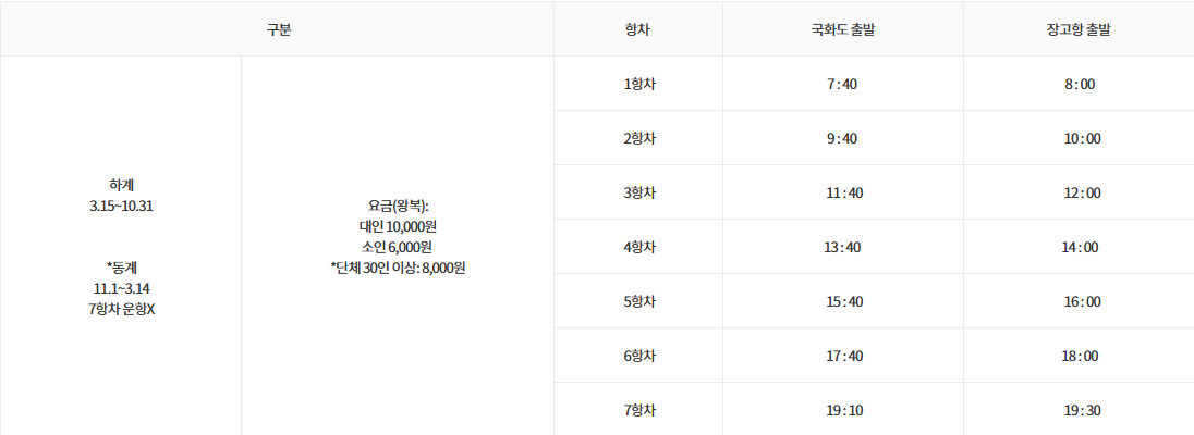- 요금(편도) : 대인 1만 원, 소인 6천 원, 화물 1kg/150