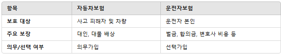- 운전자보험은 보장 한도가 훨씬 넉넉하게 제공됩니다.