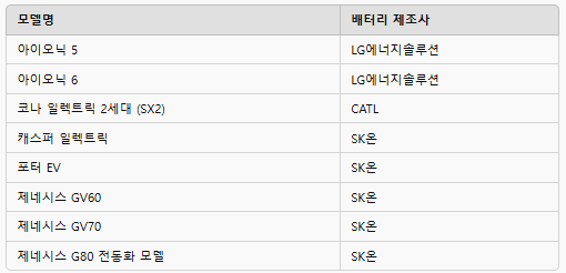 현대자동차와 기아자동차 차종 별 배터리 제조사 확인하기