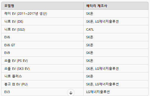 기아의 경우, 레이 EV와 니로 EV 일부 모델(SG2)에는 중국 CATL의 배터리가 탑재되었으며, 나머지 모델들은 주로 SK온과 LG에너지설루션의 배터리를 사용하고 있습니다.