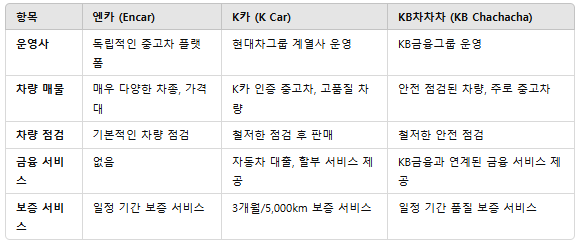 - 엔카는 다양한 중고차를 비교하고 싶을 때 유리하며, 차량 이력 조회 서비스와 정비 보증이 강점